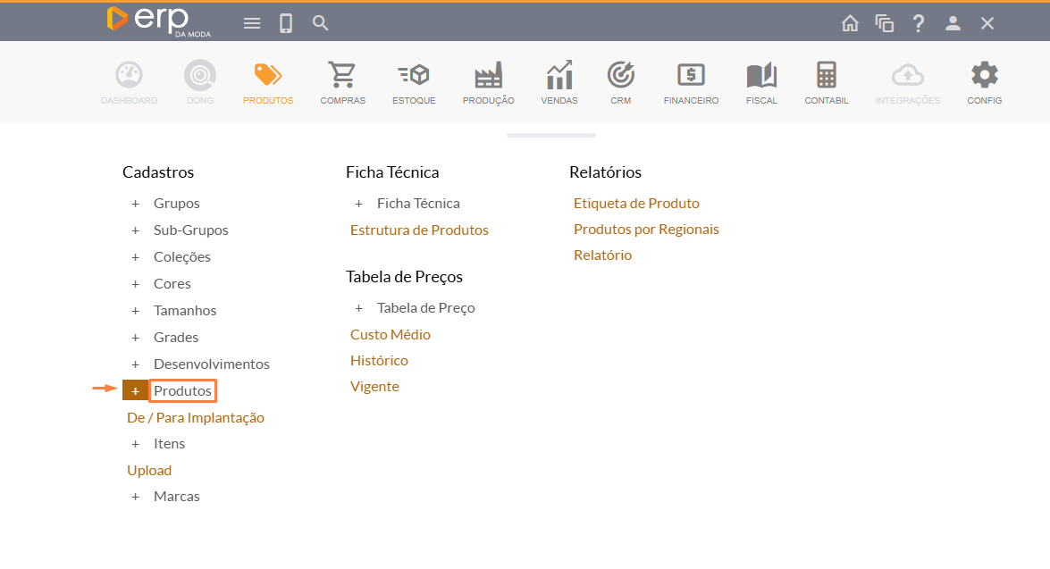 Para adicionar um produto, você deve navegar até Produtos > Cadastros e, em seguida, clicar no ícone + para Produtos.