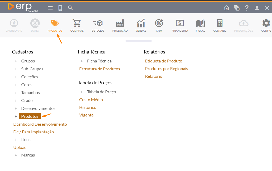 Você aprenderá como reenviar a imagem de um produto que não foi carregada no site.- Primeiro passo: abra o produto no sistema. Para isso, clique em Produtos, depois clique novamente em Produtos na aba de cadastros.