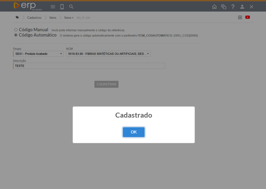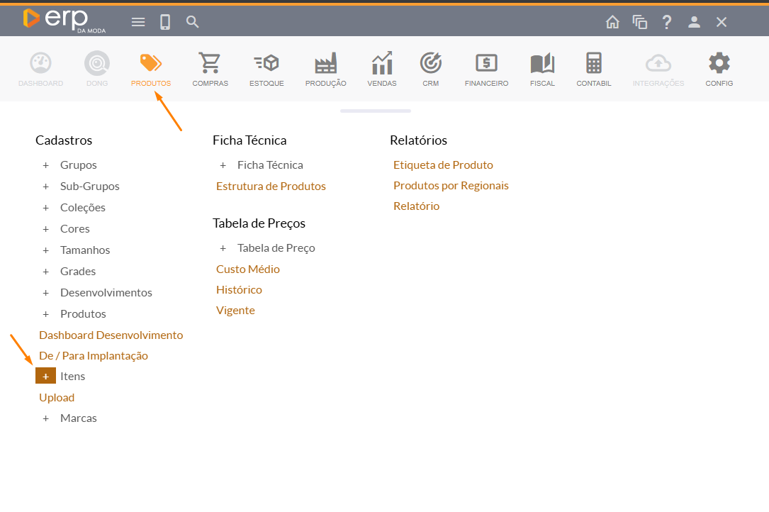 Você perceberá que na seção de cadastros há uma opção de "+ itens".