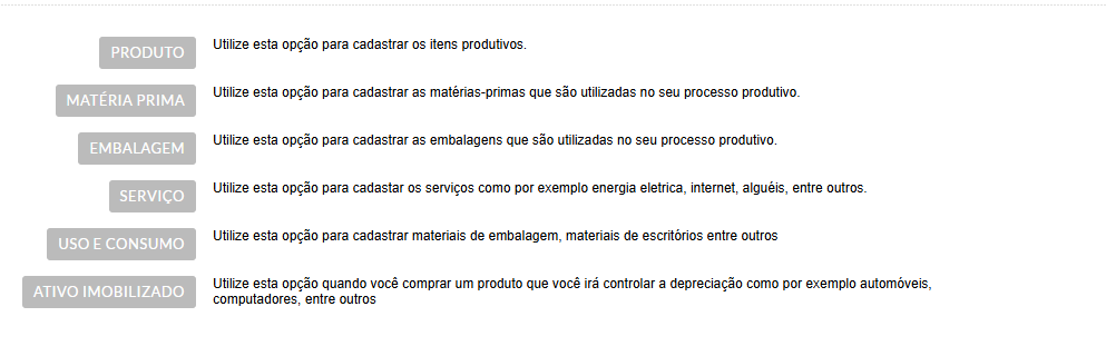 Confira as descrições de cada item e selecione aquele que deseja registrar, seja um serviço ou matéria-prima.