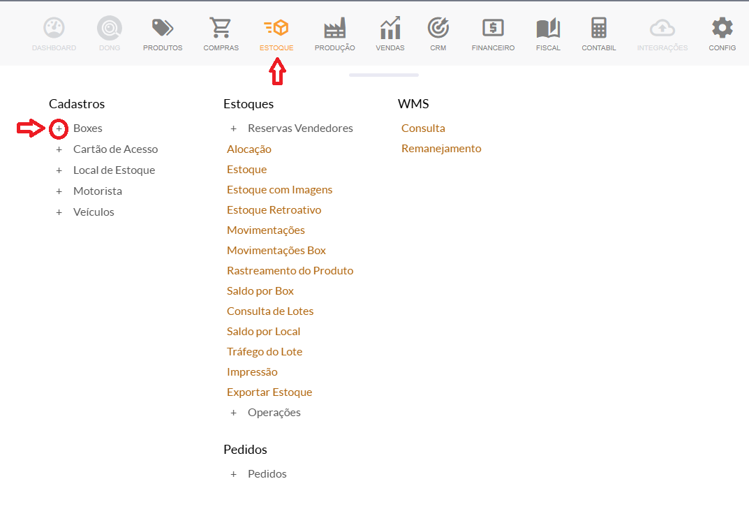 Em seguida, acesse Cadastros e clique no ícone "+" ao lado de Boxes, como indicado na imagem.