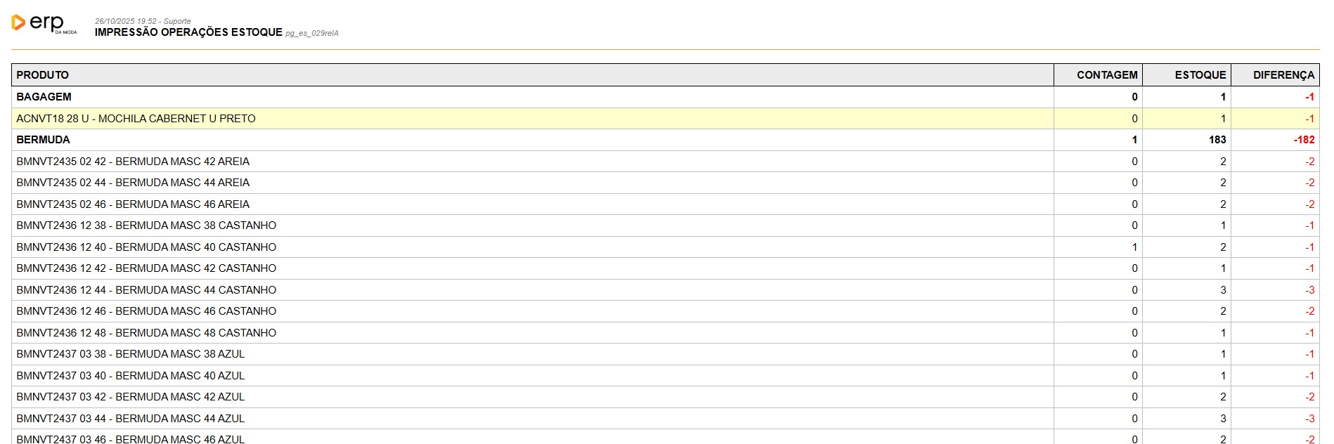 Durante o processo de inventário, é fundamental acompanhar a contagem dos produtos e identificar possíveis divergências entre o estoque físico e o registrado no sistema. O ERP da Moda oferece uma forma prática de visualizar essas diferenças diretamente na tela do inventário.