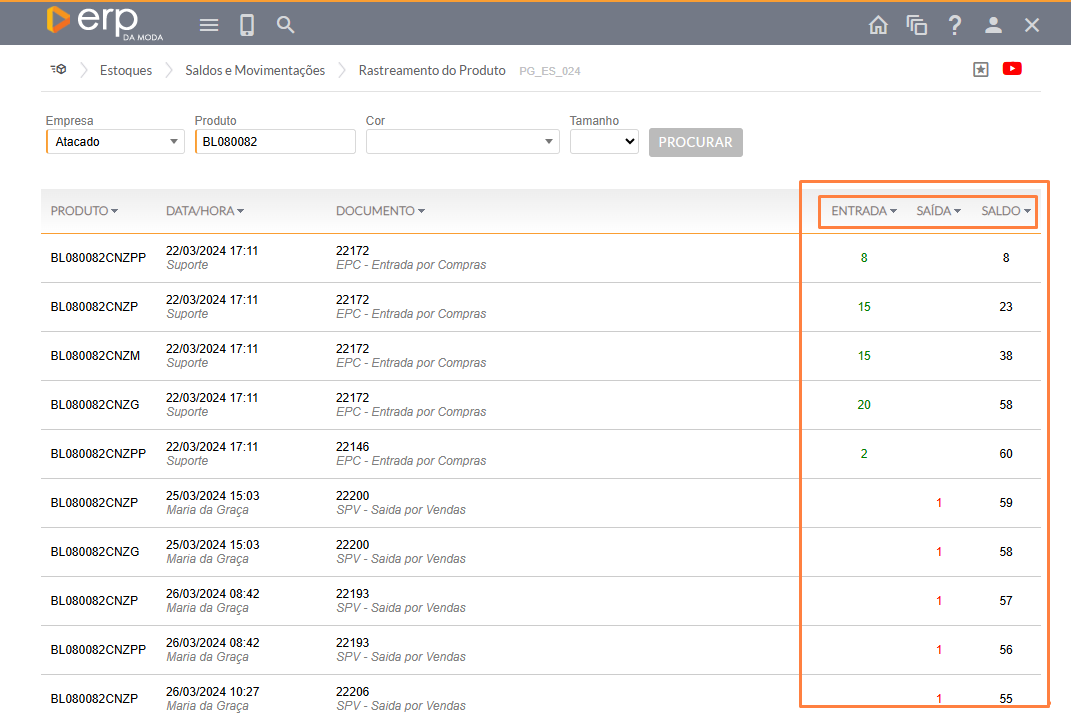 Como rastreio a movimentação de entrada e saida de produto?