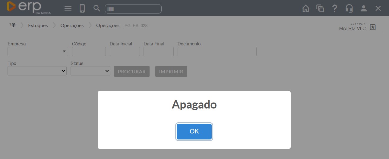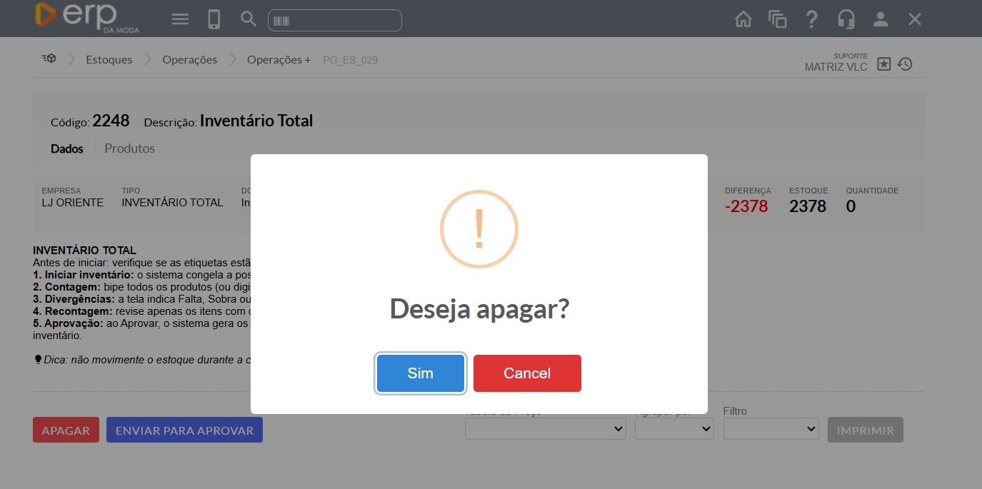 “Deseja apagar ” - Clique em “Sim” para confirmar e remover o inventário.