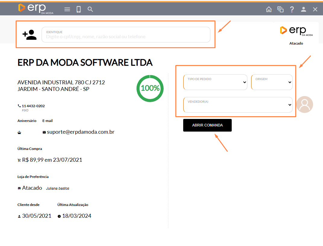 Ao lado, insira o Tipo de Pedido, a Origem e o Nome do(a) Vendedor(a).