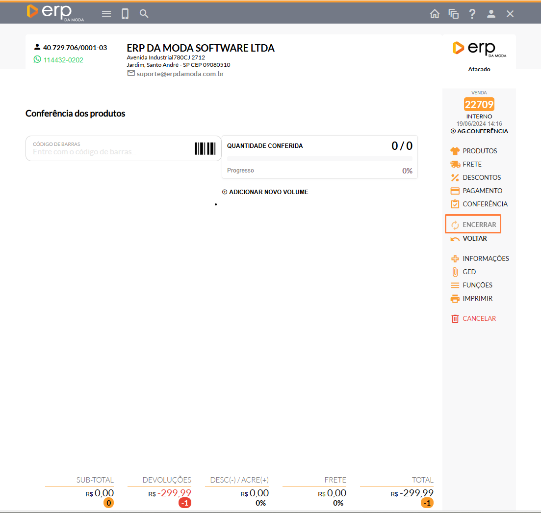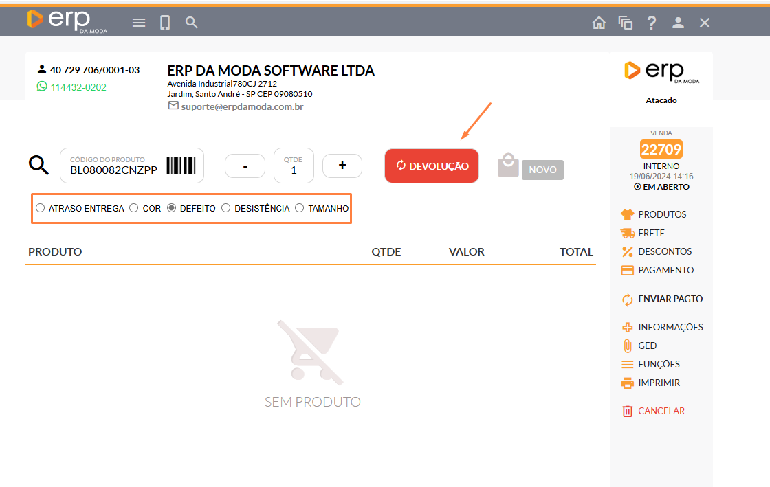 - Após abrir a comanda, você verá um ícone de devolução no qual deve clicar. Insira o código do produto e, abaixo, selecione o motivo da devolução, seja por atraso na entrega, cor, defeito, desistência ou tamanho. Pressione "ENTER" para incluir o item no seu pedido de devolução.