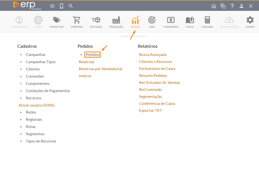 - Primeiro, acesse Vendas > Pedidos e selecione a opção Pedidos.