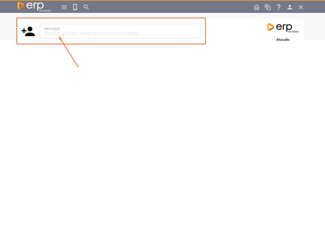 - Após esta etapa, você será direcionado para uma seção onde precisará identificar o cliente para o qual deseja realizar um novo pedido. Insira o CPF/CNPJ, nome, razão social ou número de telefone para localizá-lo.