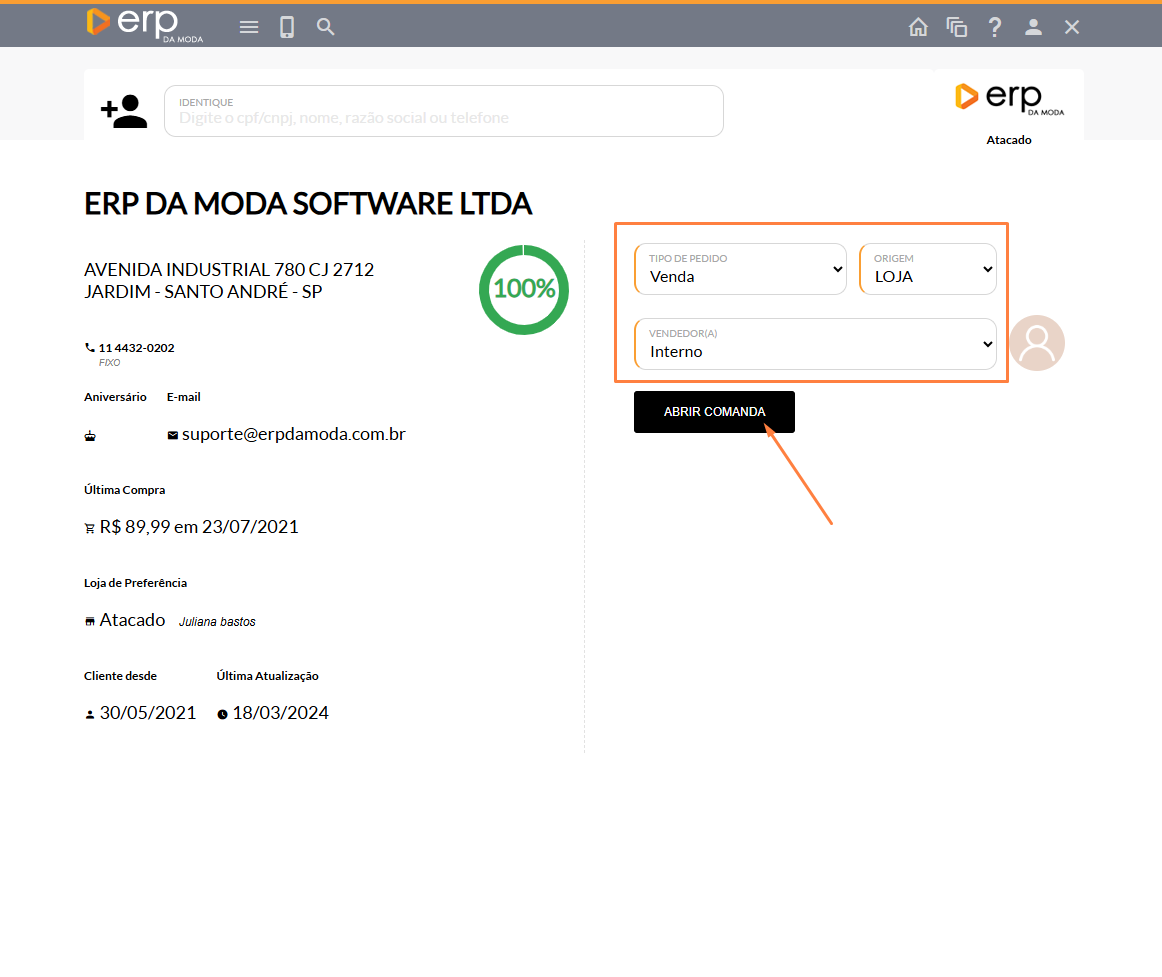 - Após preencher todos os dados, selecione "ABRIR COMANDA".