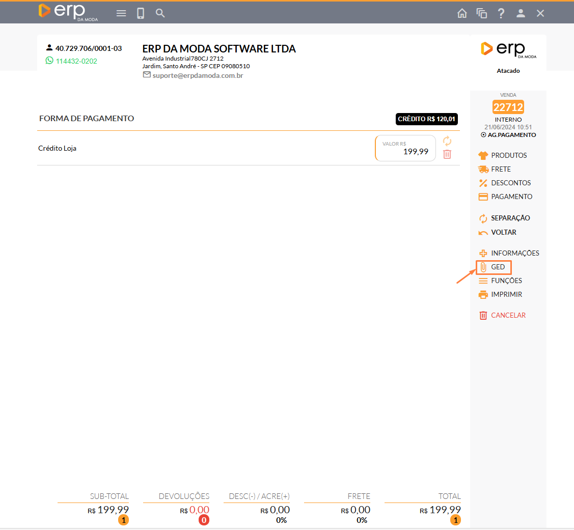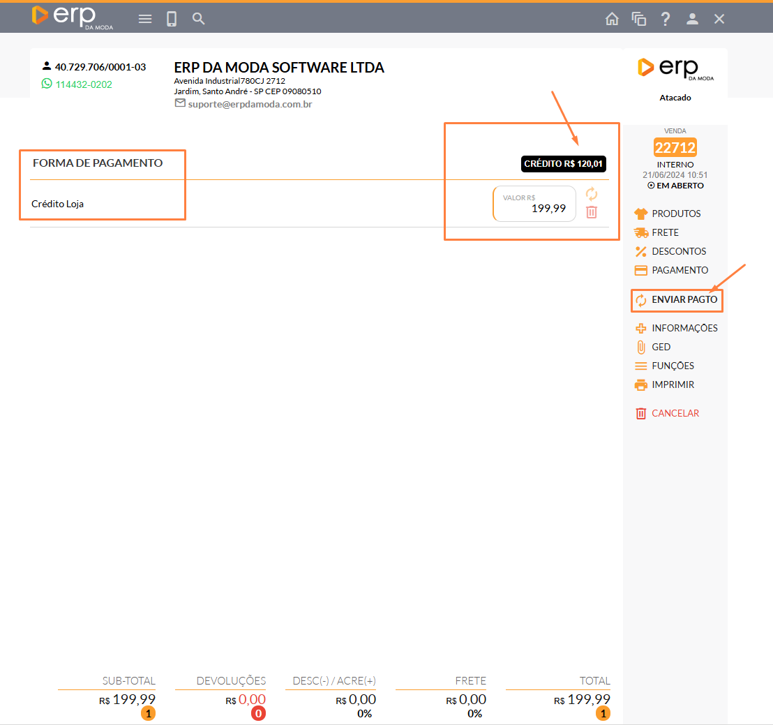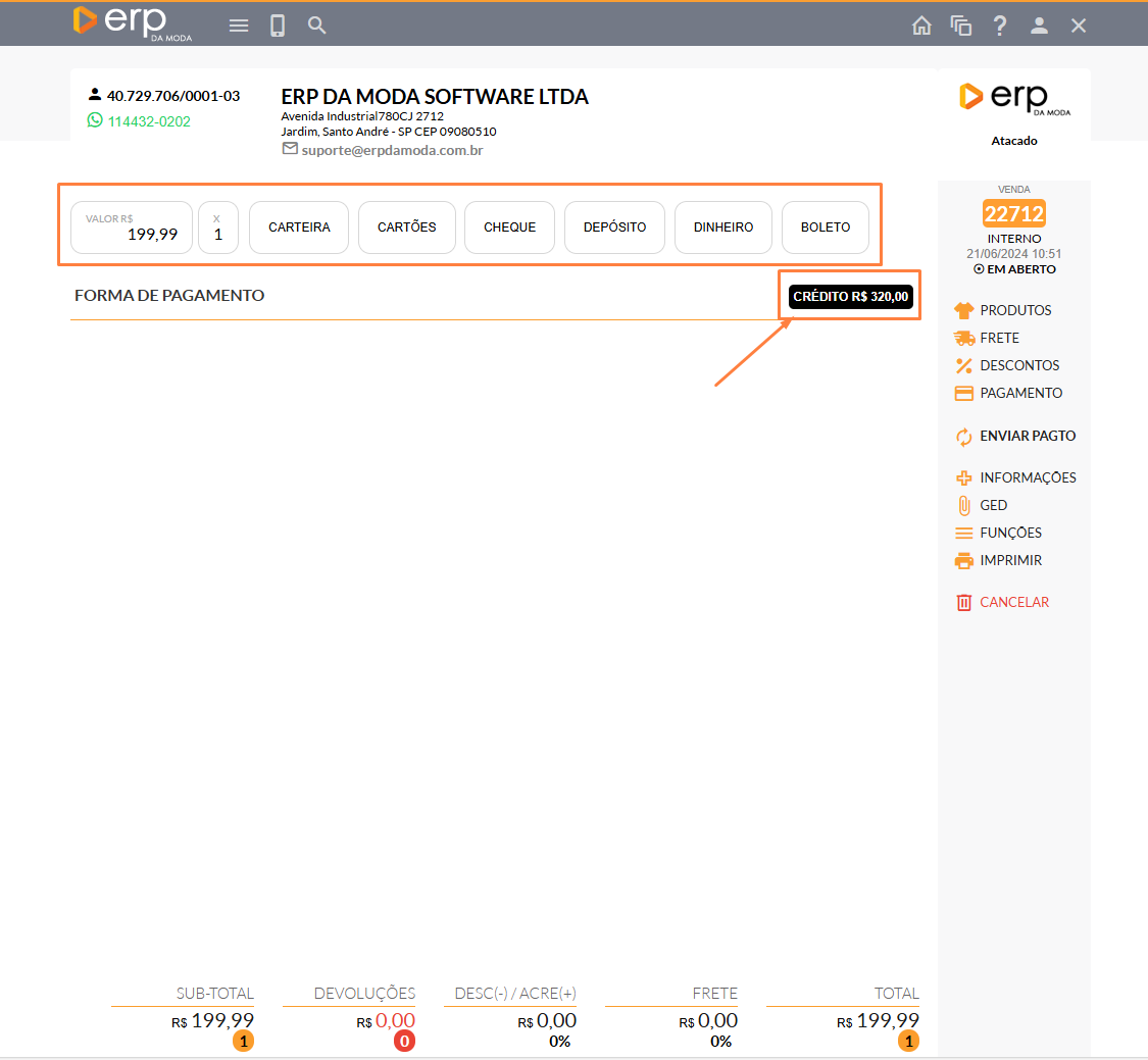 Ao encerrar a tela, perceberá que o valor de Crédito foi reduzido, conforme ilustrado na imagem a seguir. Observa-se também que a forma de pagamento foi alterada para Crédito Loja.