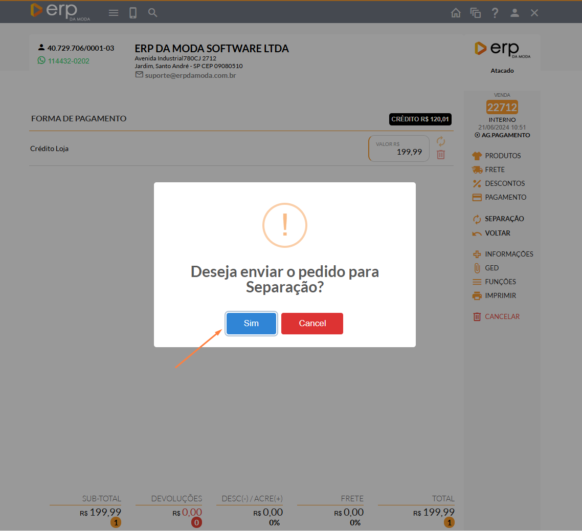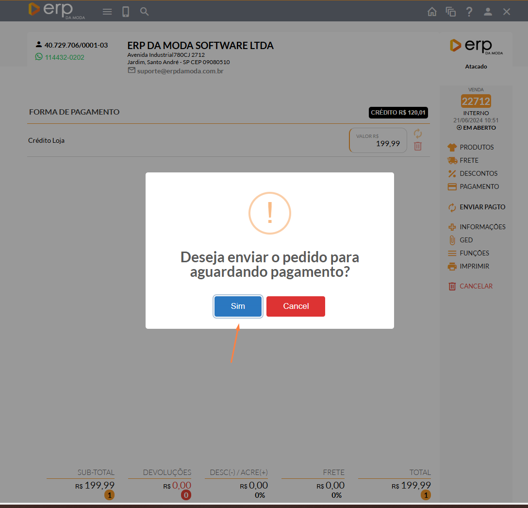 - Será exibida uma pequena janela questionando se deseja enviar o pedido para o status de aguardando pagamento. Nesse caso, você deve clicar em "SIM".