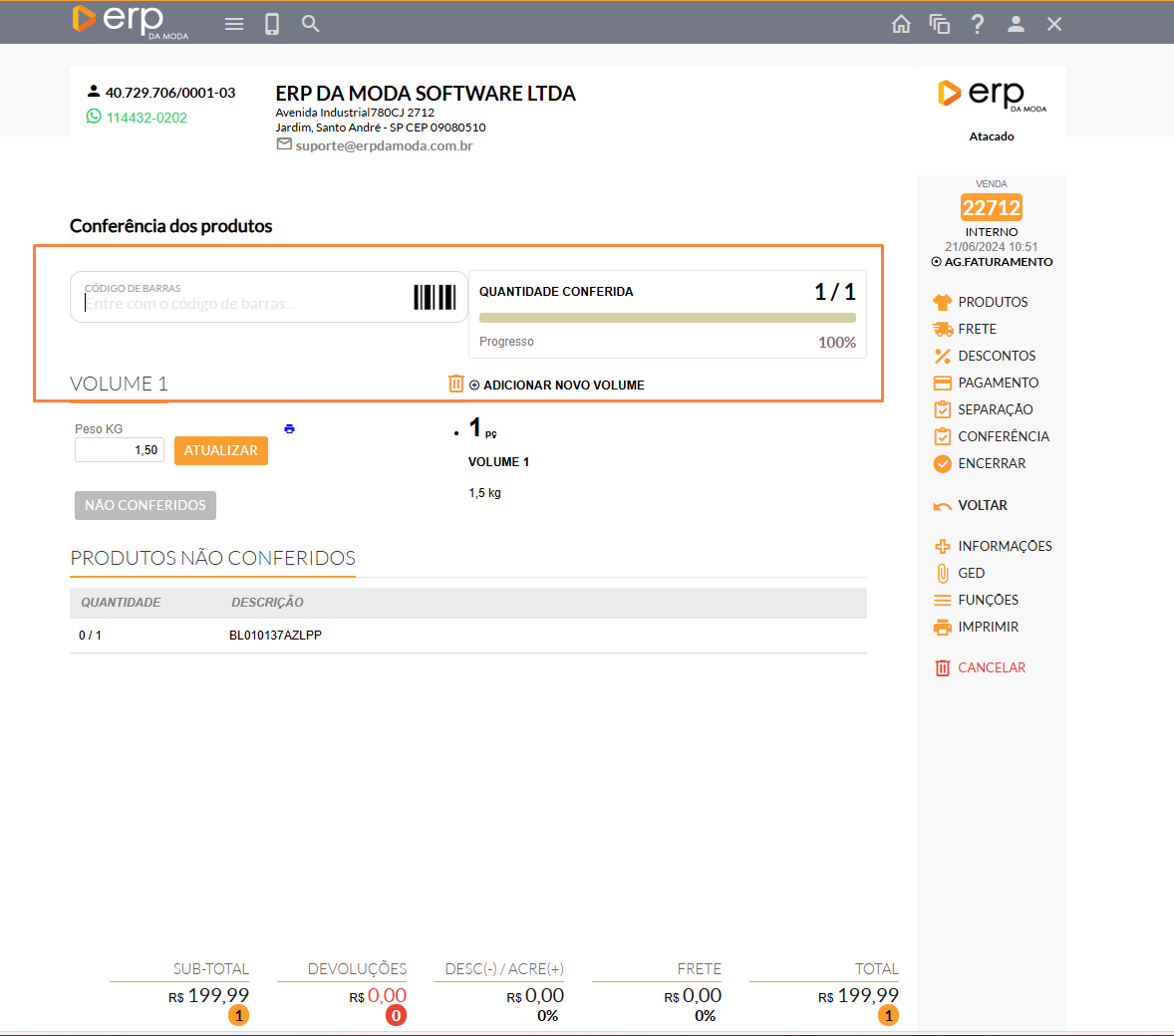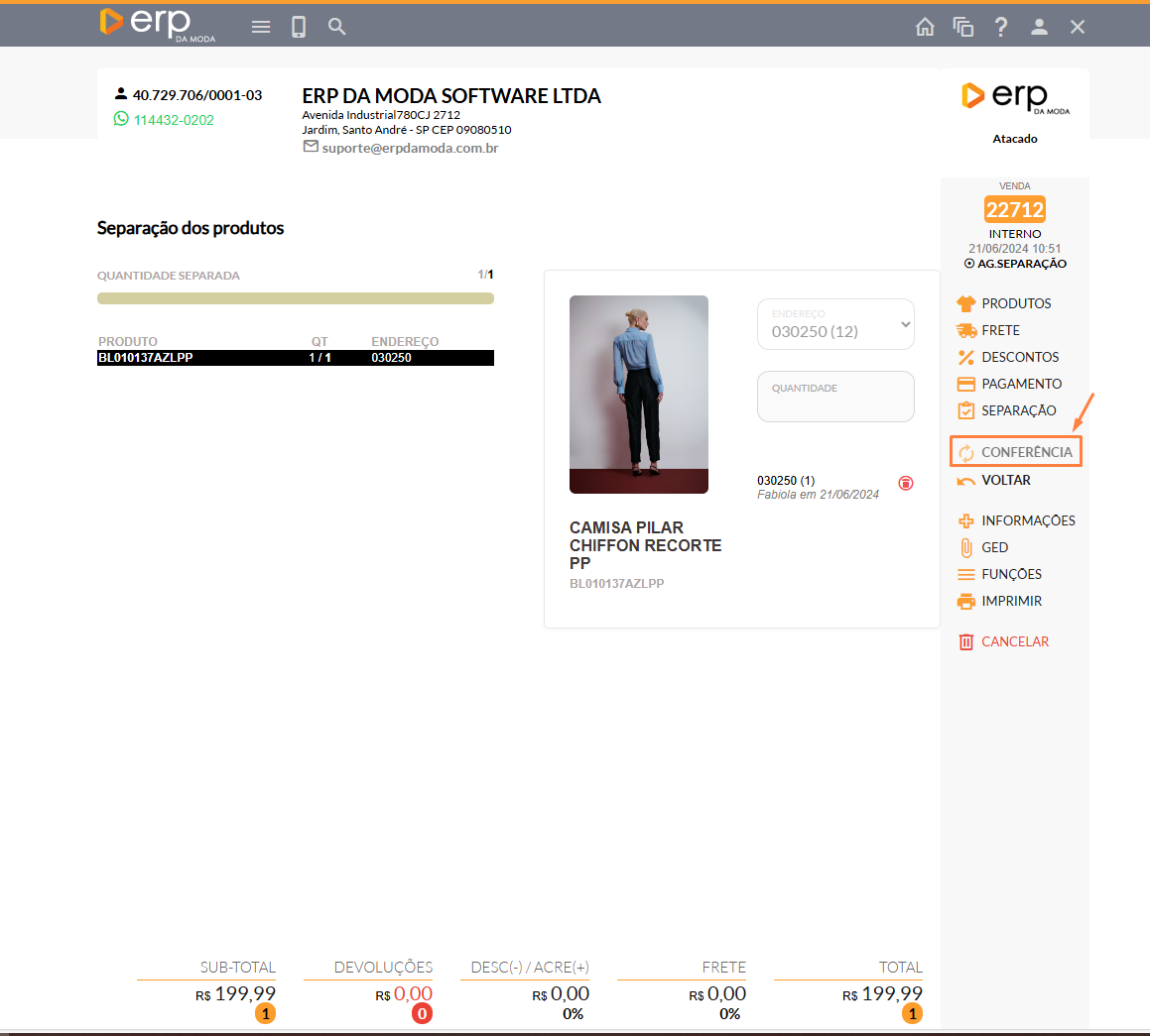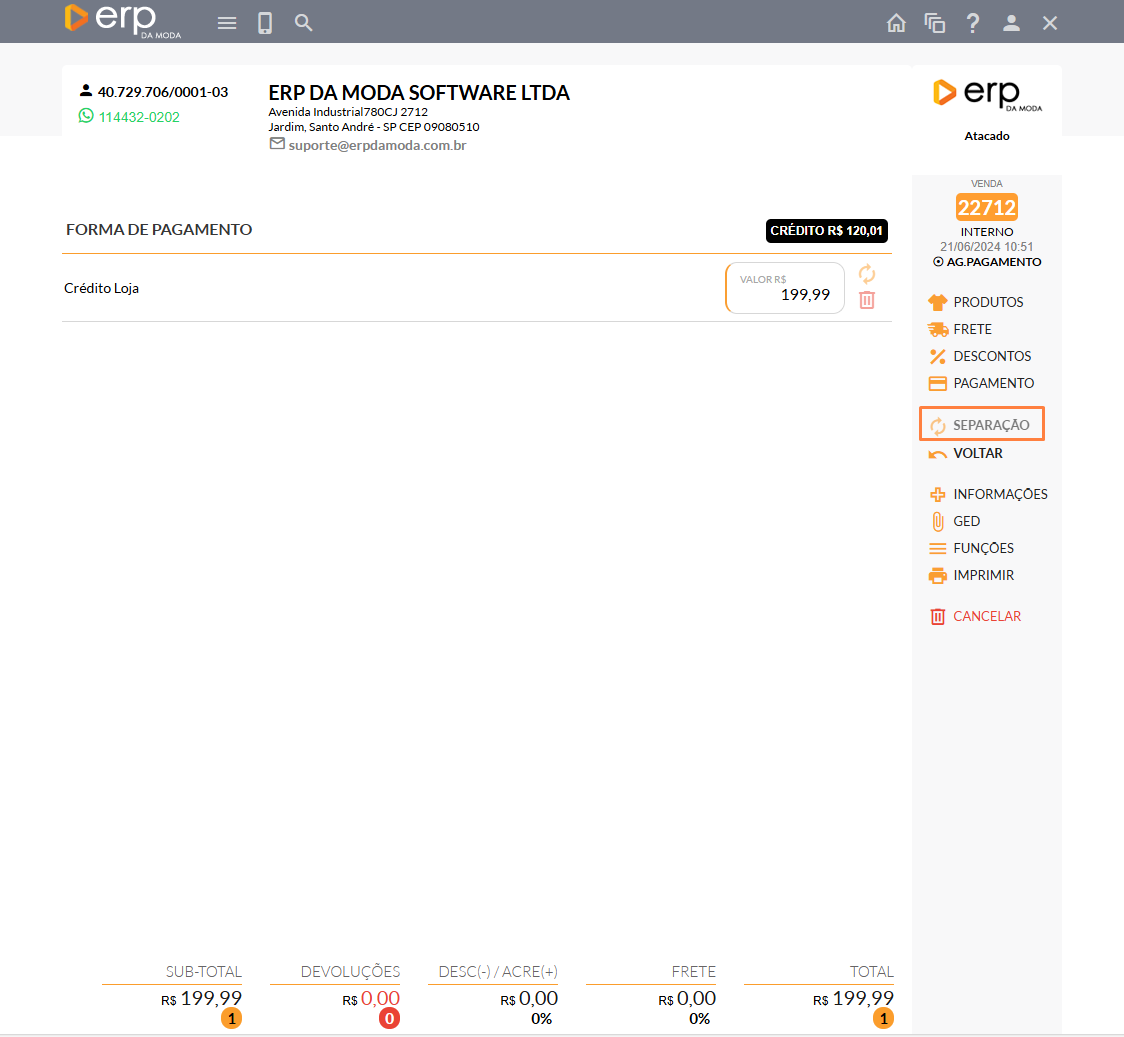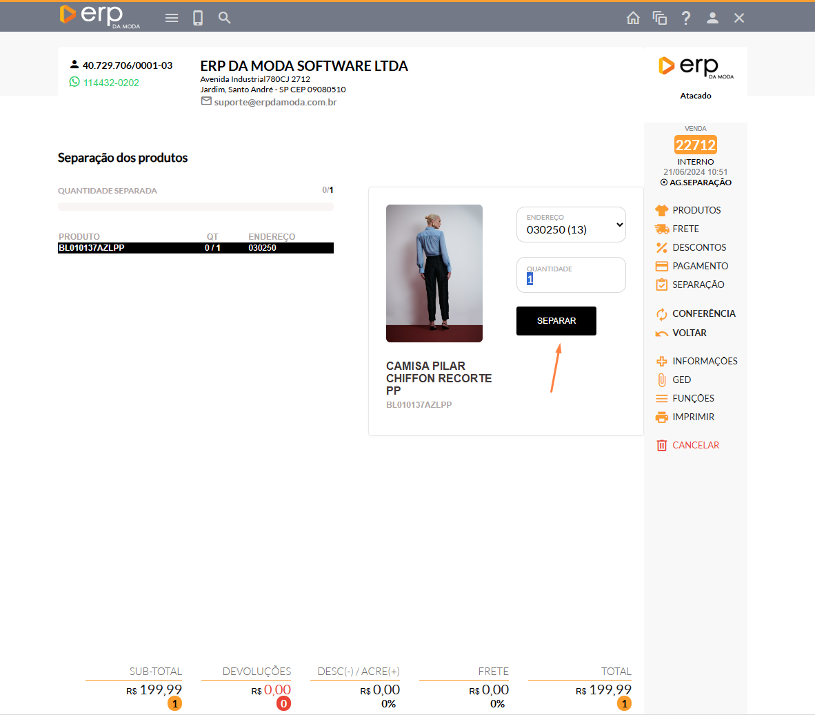 - Para prosseguir com a realização do seu pedido, clique em "SEPARAÇÃO".