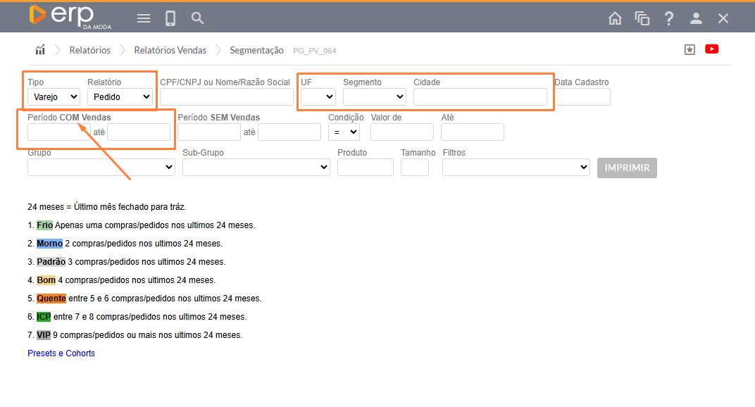 - Ao abrir, você notará que o campo de busca oferece várias opções: Tipo, Relatório, CPF/CNPJ, UF, Segmento, Cidade, Período COM vendas, Período SEM vendas, Valor, Grupos e Subgrupos.