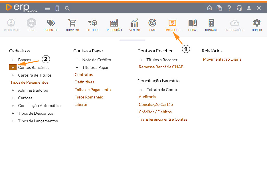 No menu, acesse o módulo FINANCEIRO e depois, em Cadastros, clique no ícone