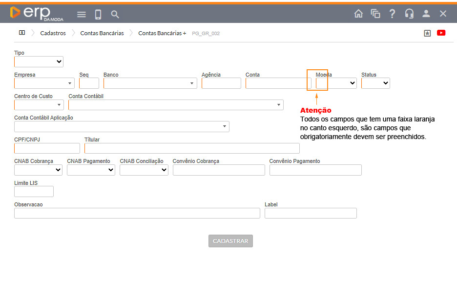 Preencha todos os campos obrigatórios e clique em CADASTRAR.