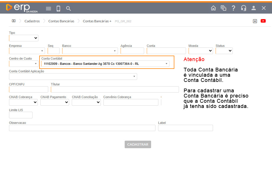 Toda Conta Bancária é vinculada a uma Conta Contábil e por esta razão, ela devera ter sido previamente cadastrada, certifique-se que a conta contábil foi cadastrada antes de criar a Conta Bancária.