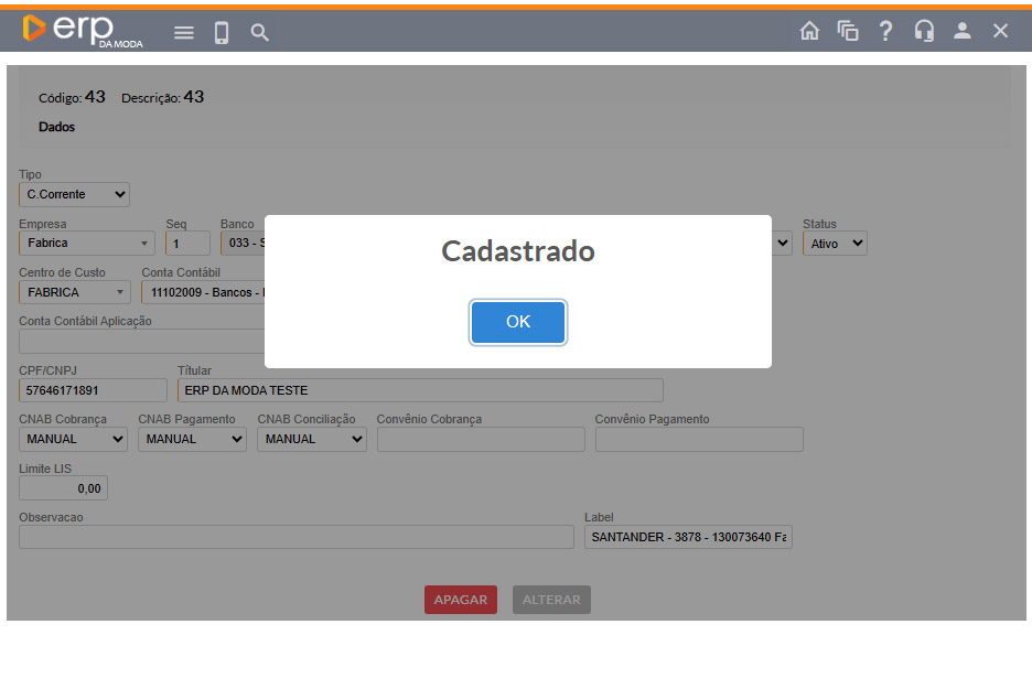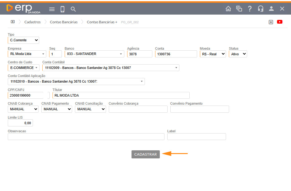 O cadastro de Contas Bancárias é uma etapa essencial para o controle financeiro da empresa.