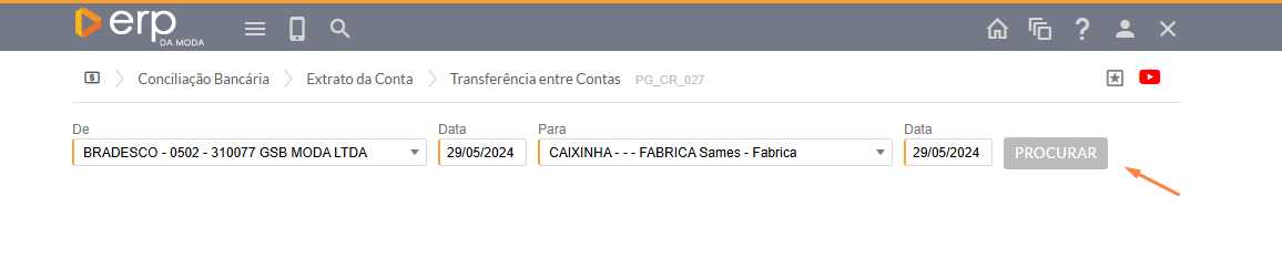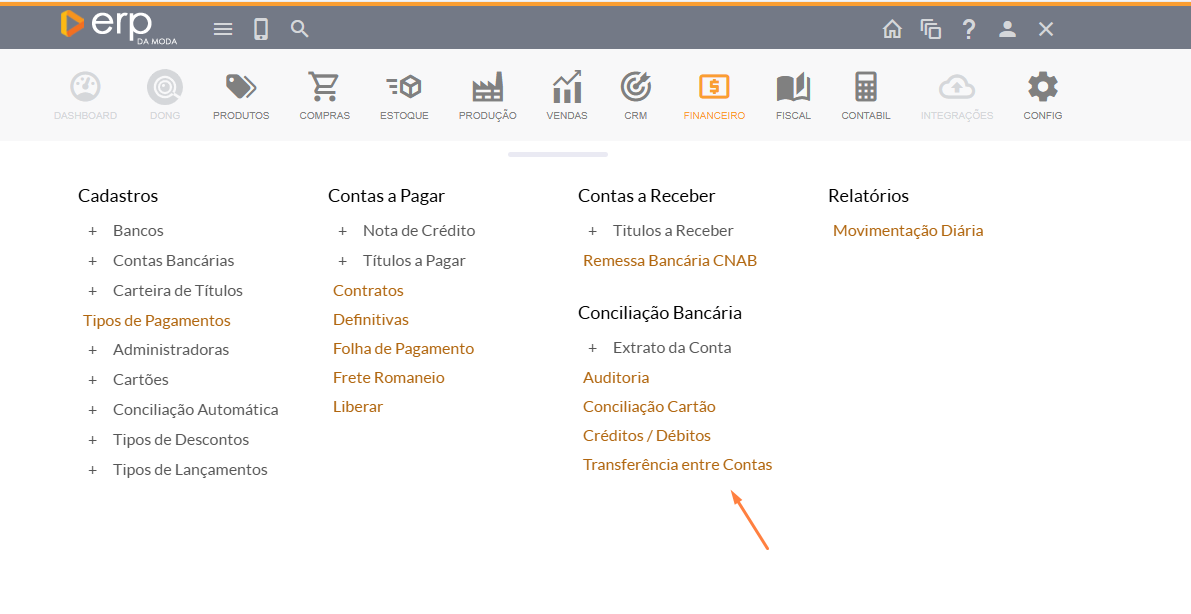 - Para fazer a conciliação de uma transferência de contas, você deverá ir em Financeiro > Conciliação Bancária > Transferência entre Contas