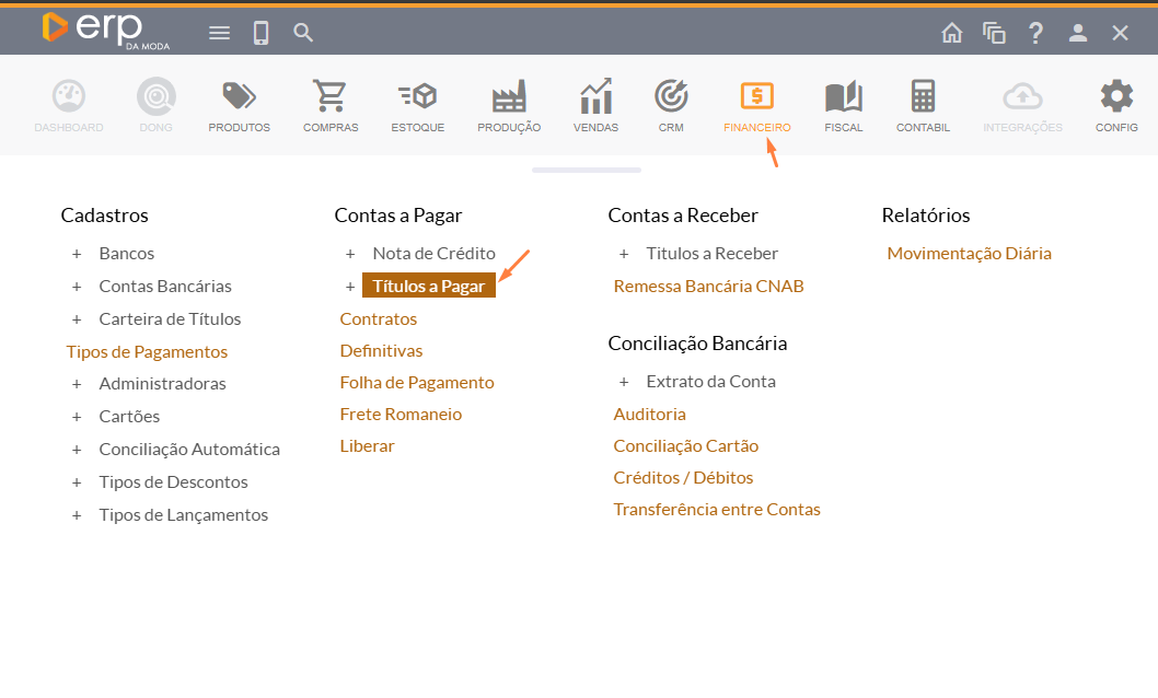 Para reverter um título já liberado que possui data de vencimento ou dados bancários incorretos, pode-se seguir o seguinte procedimento:- Primeiramente, acesse a seção Financeiro e selecione Títulos a pagar, em seguida clique na opção Títulos a pagar.