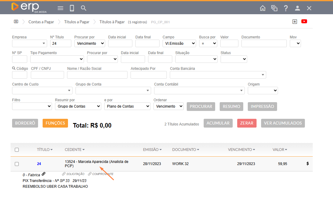 - Utilize os filtros de busca para encontrar o título que você deseja estornar.