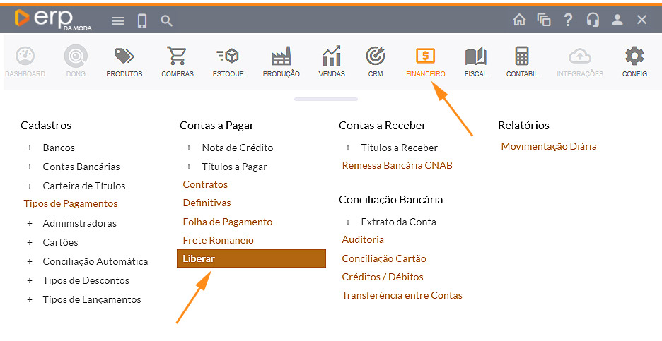 Selecione o módulo FINANCEIRO em seguida, na coluna de Contas a Pagar, clique em Liberar.