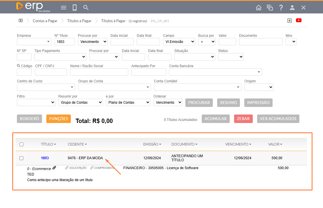 - Neste primeiro exemplo, trata-se de um título em aberto. O processo entre um título em aberto e outro que já foi pago é diferente.