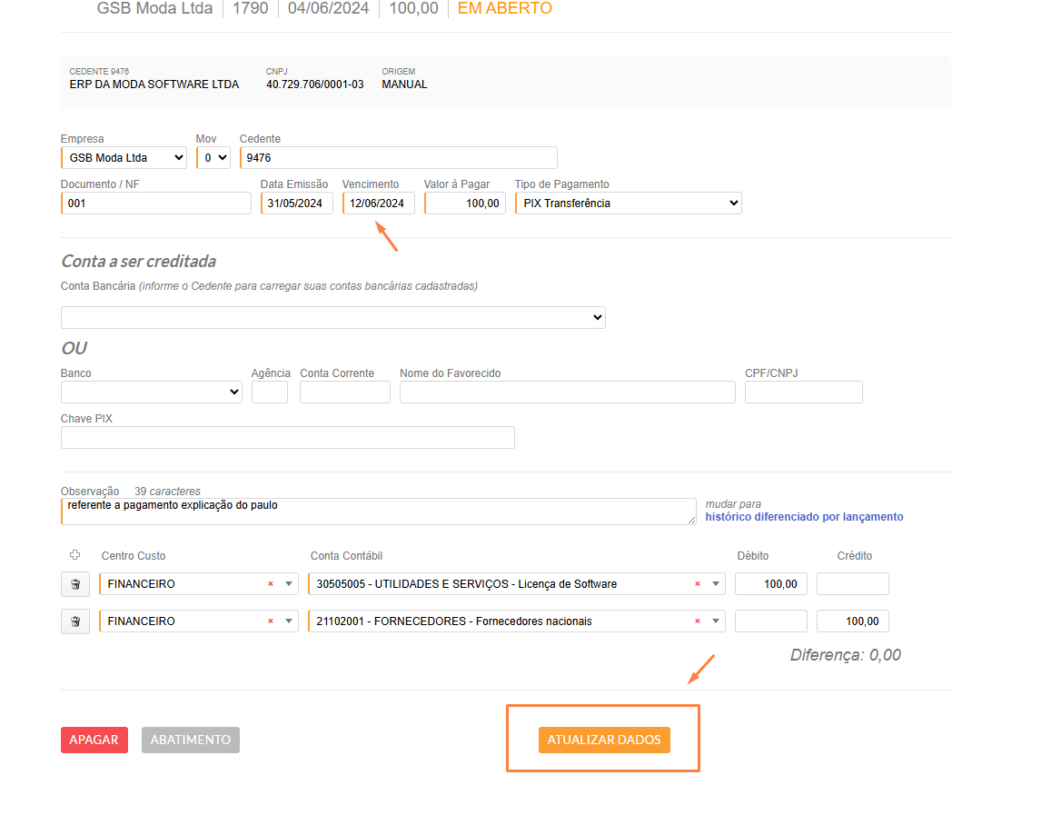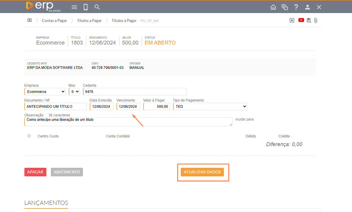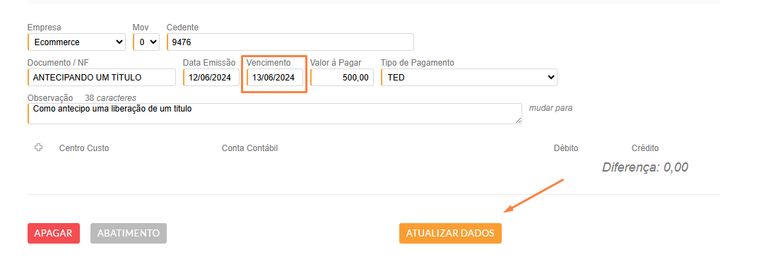 No caso de um título em aberto, você pode atualizar diretamente. Simplesmente substitua a data de vencimento por outra e clique em "ATUALIZAR DADOS".
