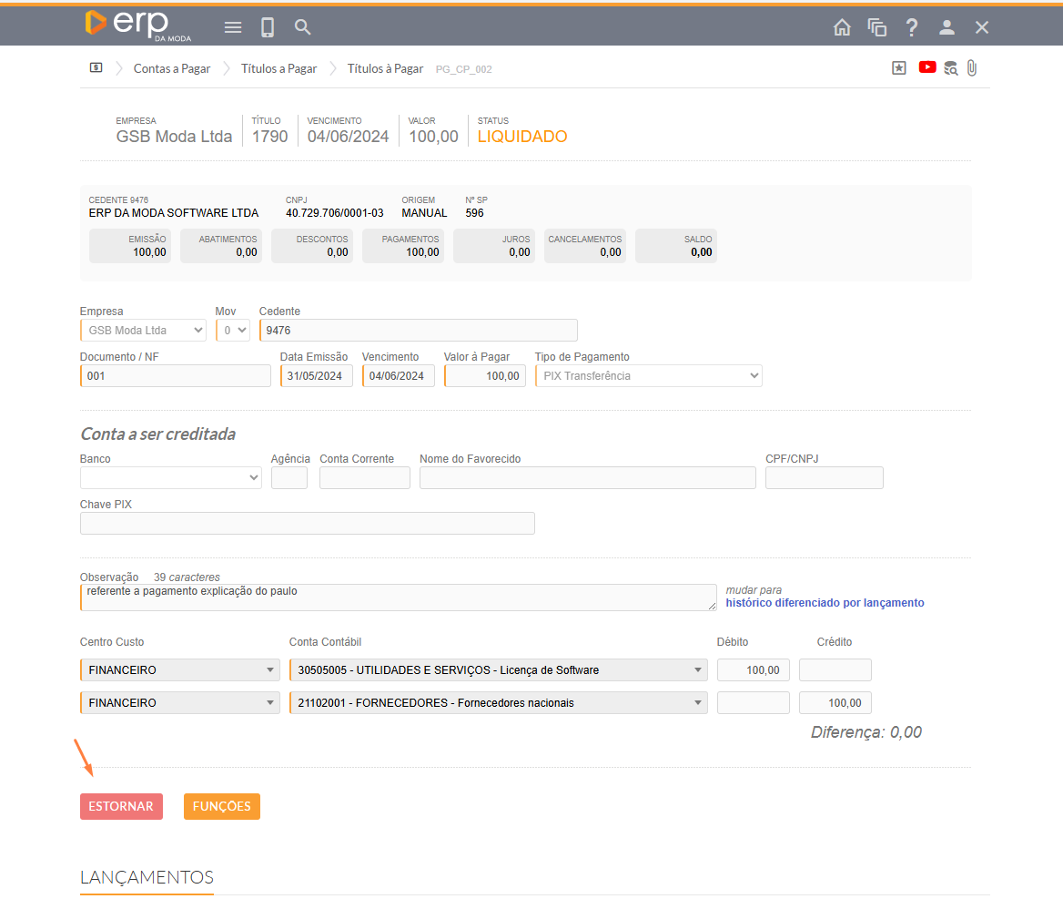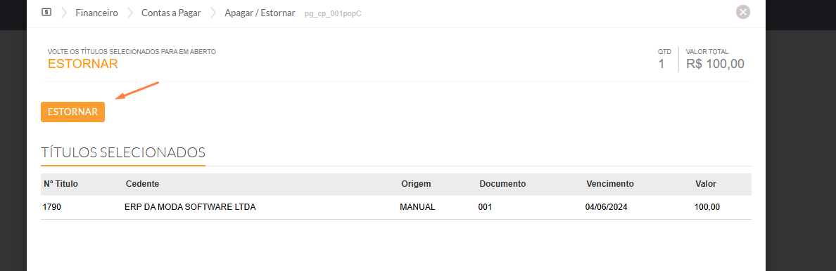 - Quando você abrir o título que quer modificar, notará que os campos não estão disponíveis para alterações. Portanto, será necessário realizar o estorno do valor clicando em "ESTORNAR".