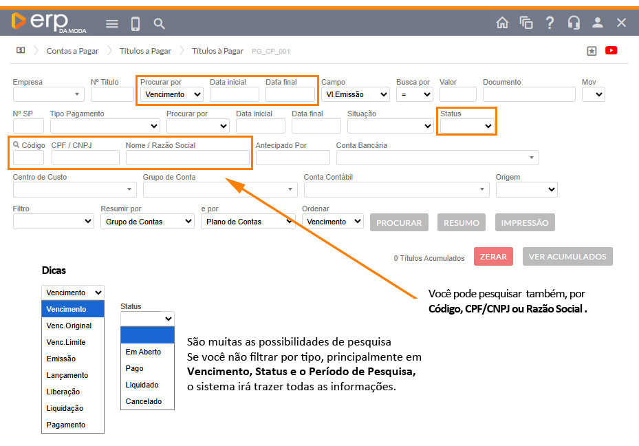 - Procurar por: selecione o critério principal da pesquisa, como Vencimento, Emissão ou Pagamento.