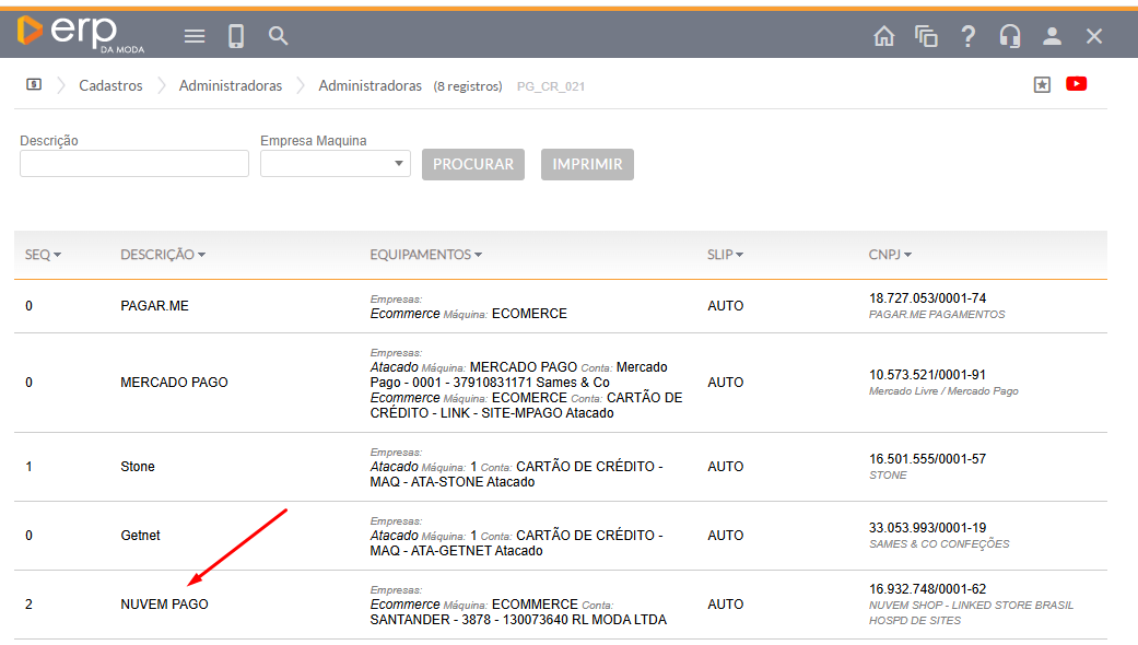 maquininhas de cartão, na coluna DESCRIÇÃO, clique na empresa que