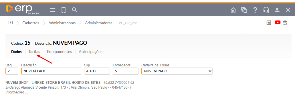 Na tela em que aparece a empresa cadastrada, clique em Tarifas.