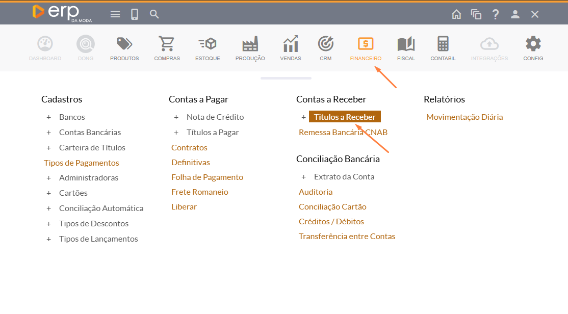 Cancelar ou apagar um título a receber nas contas a receber é uma tarefa simples. Neste guia, você aprenderá como realizar essa função de forma rápida.- Para iniciar esse processo, clique em Financeiro, depois em Contas a Receber e selecione Título a Receber.