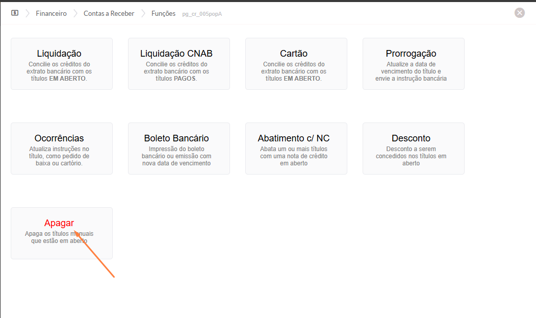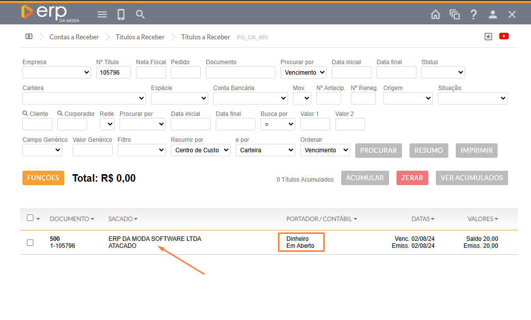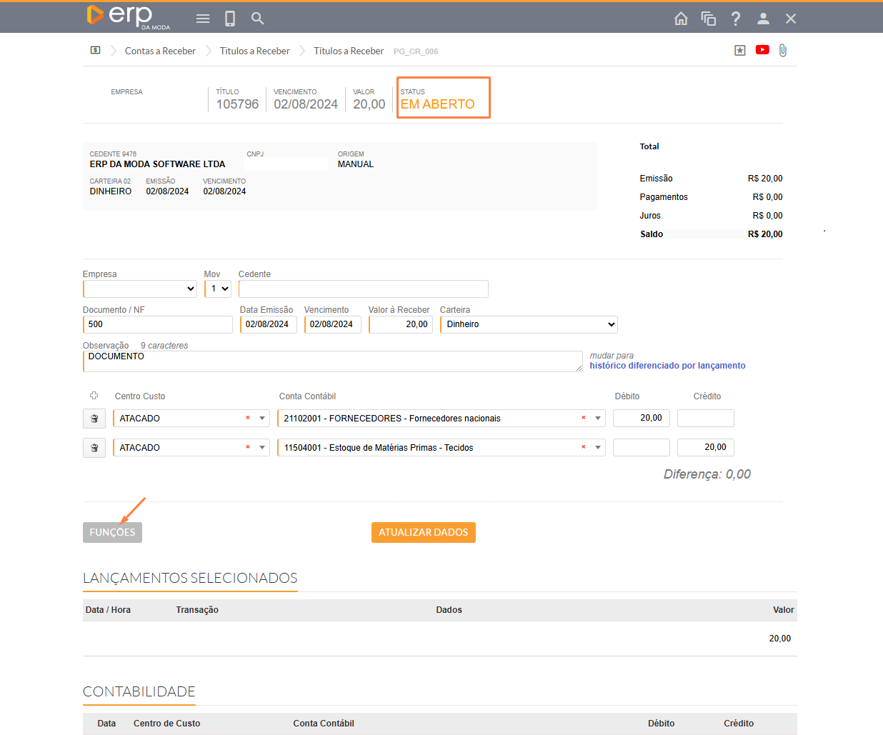 - Ao abri-lo, você perceberá que o título está com o status "EM ABERTO". Na parte inferior da tela, há um botão denominado "FUNÇÕES"; clique nele.