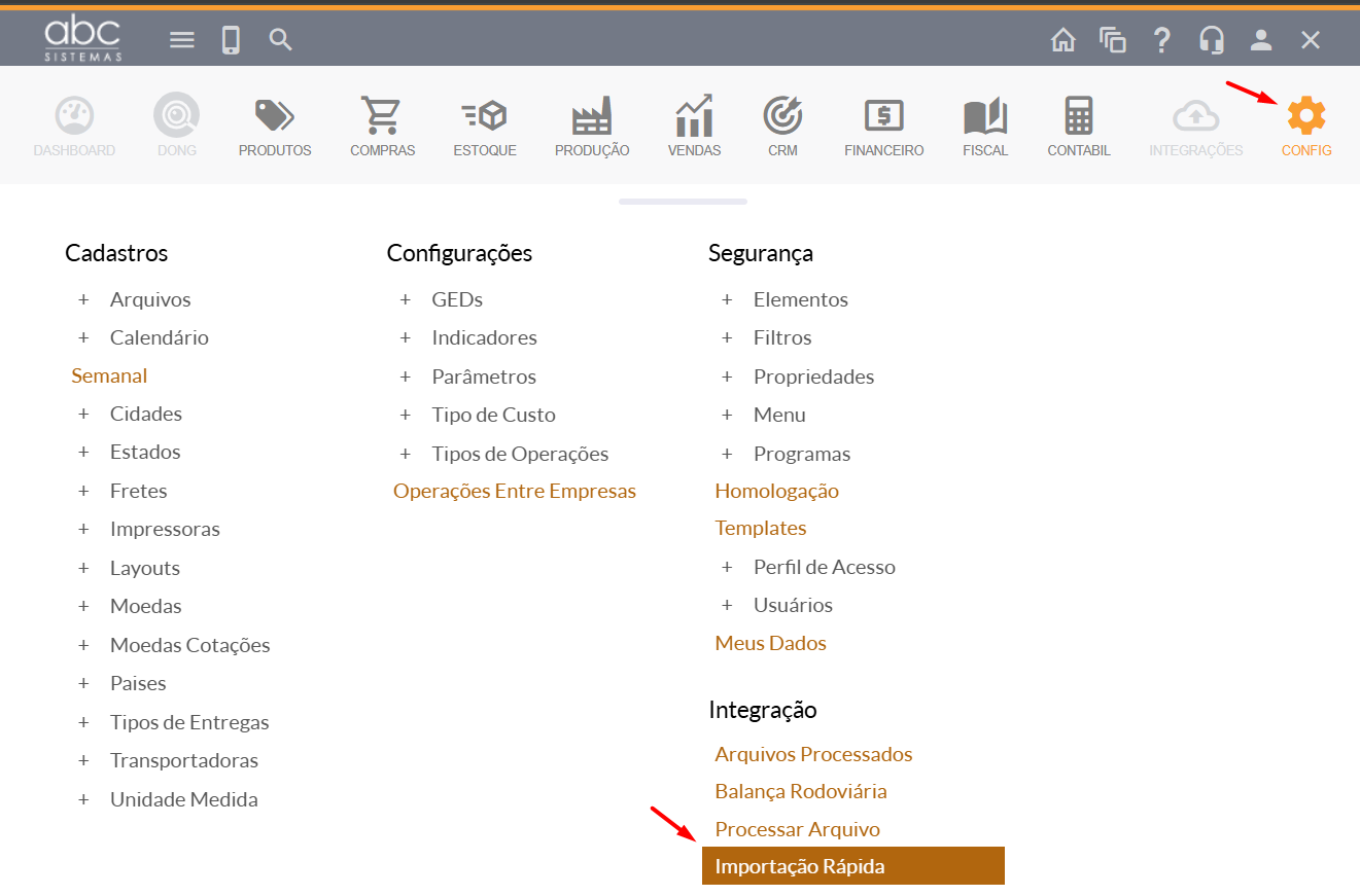 Para realizar a importação do Extrato Bancário de forma rápida.Será necessário acessar CONFIGURAÇÕES, acessando Importação Rápida.