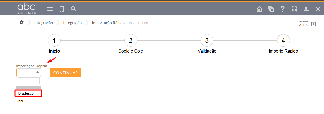 Será necessário escolher o banco para realizar a importação rápida, e clicar em continuar.