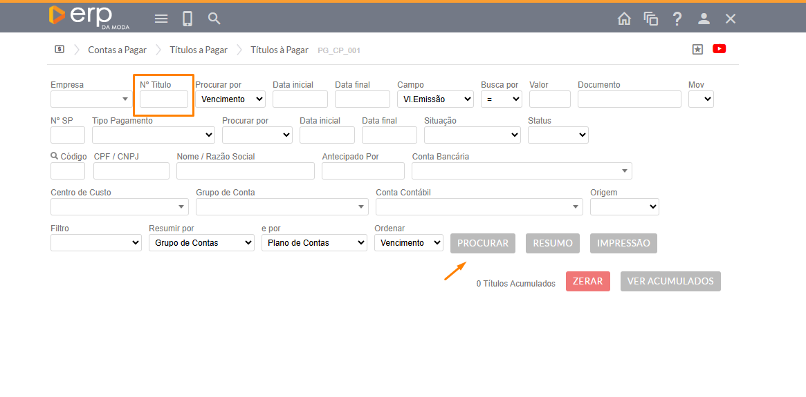 - Navegue até a seção "Financeiro" > "Contas a Pagar" e clique em "Títulos a Pagar".