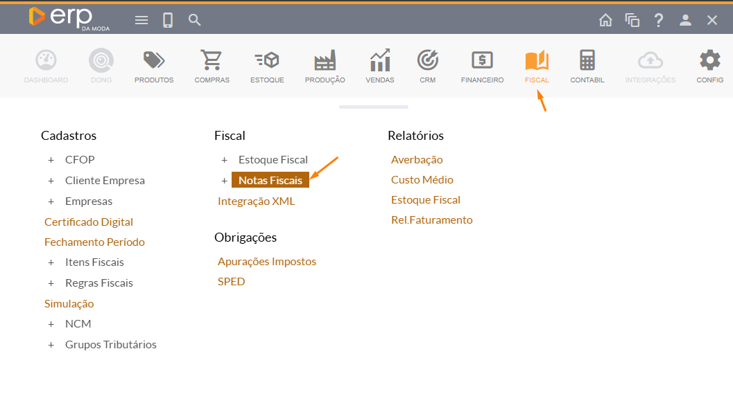 Para excluir uma nota fiscal, certifique-se de que ela está com o status "validada" ou "em digitação". Se a nota já estiver com o status "Autorizada", você só terá a opção de CANCELAR.- Primeiramente, vá até a aba Fiscal e clique em Notas Fiscais.
