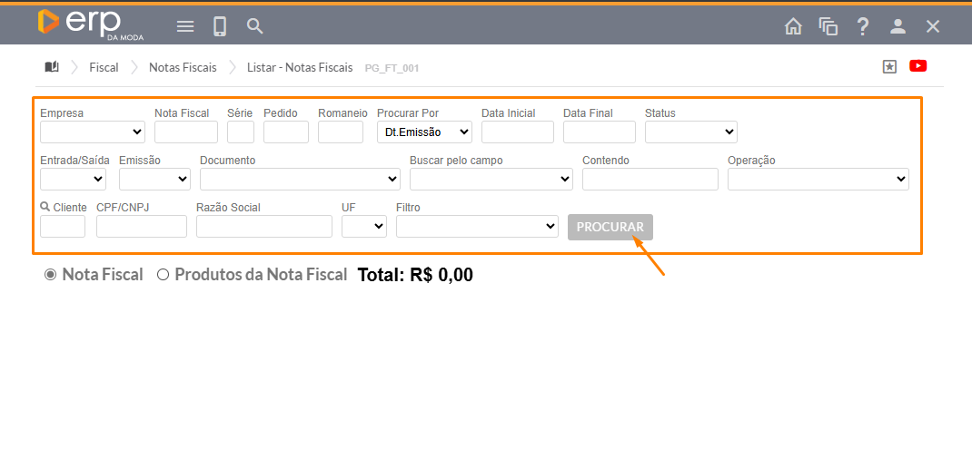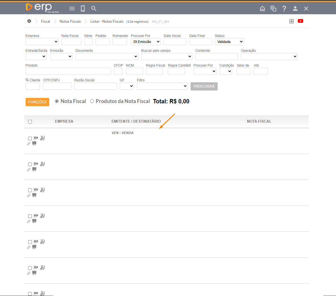 Em seguida, localize a nota fiscal que deseja excluir.