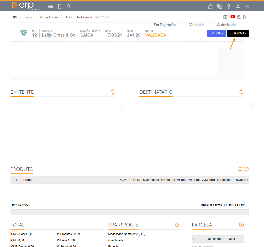 - Ao abrir a nota fiscal, se ela estiver com o status VALIDADA, você precisará estorná-la primeiro, clicando em ESTORNAR.