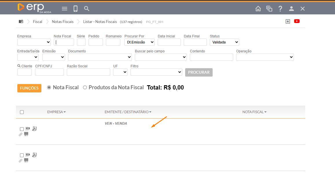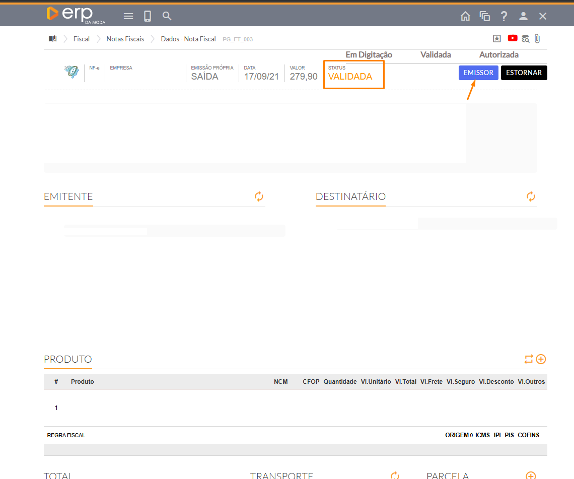 Se a nota fiscal ainda não estiver validada, será necessário validá-la primeiro.