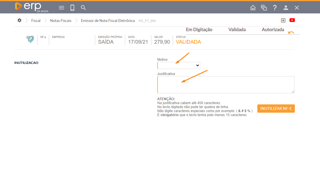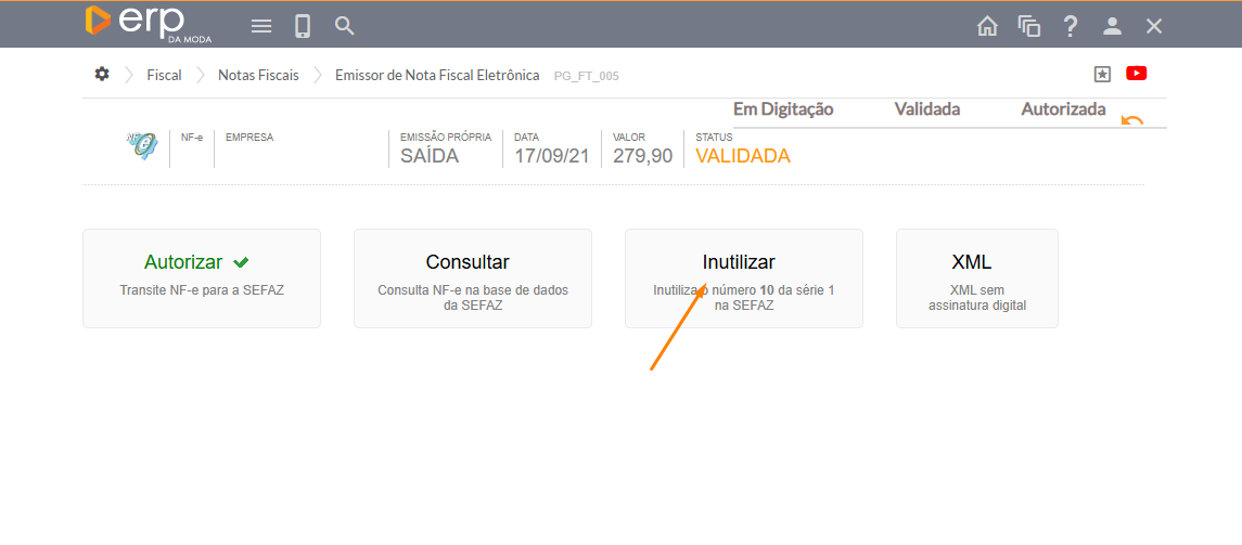 Para ser inutilizada, a nota fiscal deve ter o status de "VALIDADA".