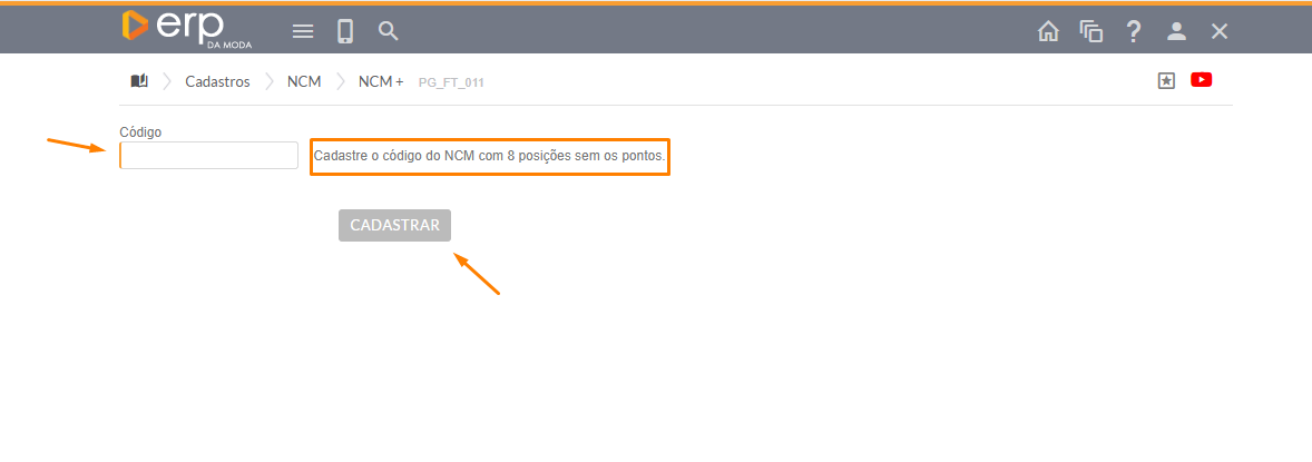 , você será redirecionado para a página onde deverá inserir o número do código NCM que deseja habilitar.
