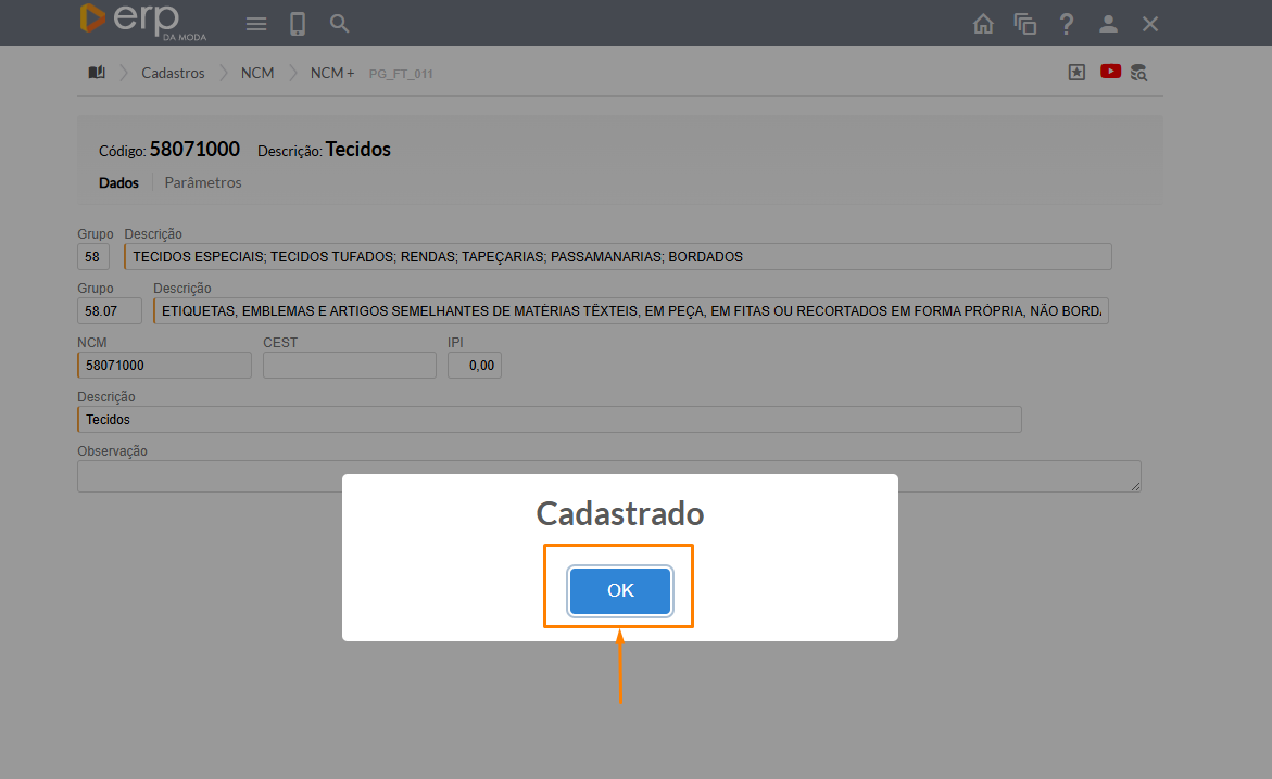 Pronto, seu NCM foi cadastrado com sucesso!