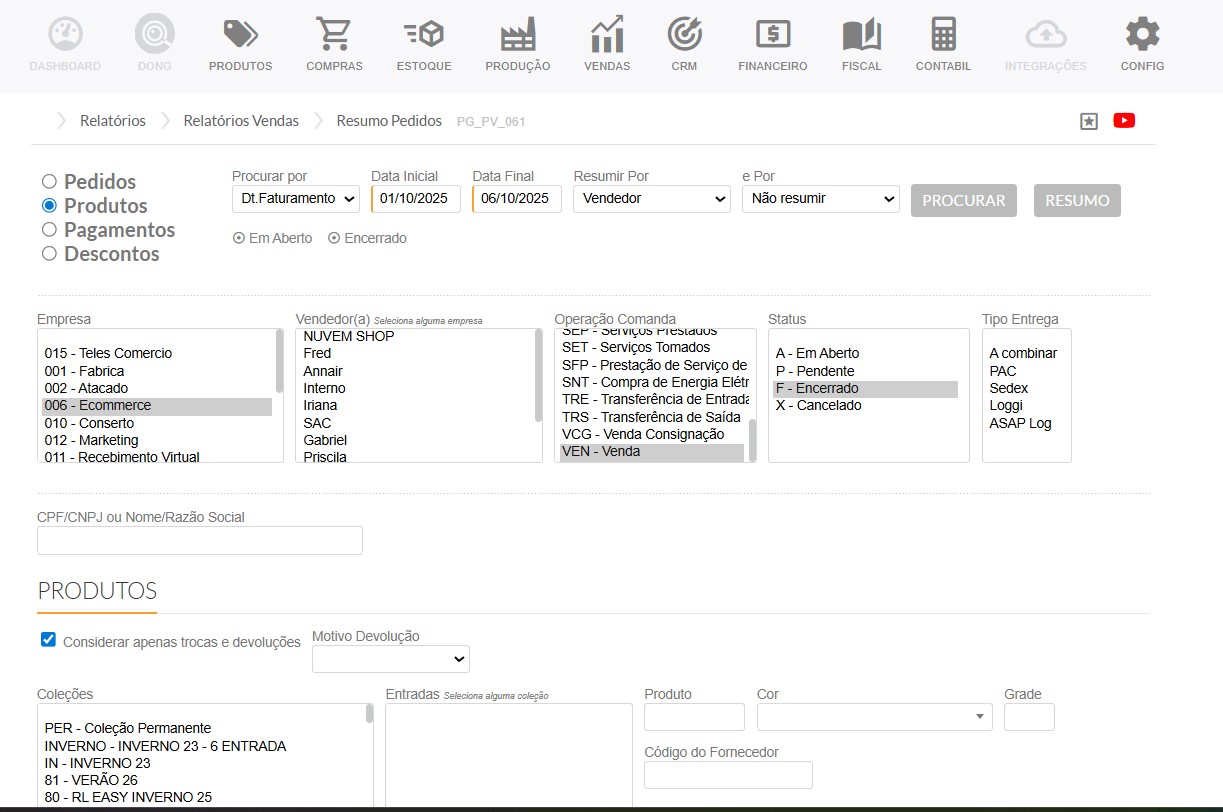 Além disso, você pode personalizar a visualização utilizando os campos “Resumir Por” e “Por”, escolhendo se deseja agrupar os dados por Pedido ou por Produto, conforme a necessidade da análise.