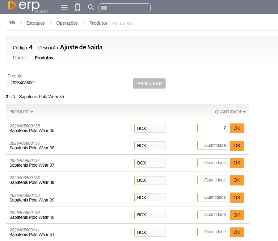 Exemplo prático: quando a etiqueta cadastrada no sistema está como tamanho M, mas a peça física é G, é possível ajustar a movimentação realizando uma Saída da peça M e depois uma Entrada da peça G.