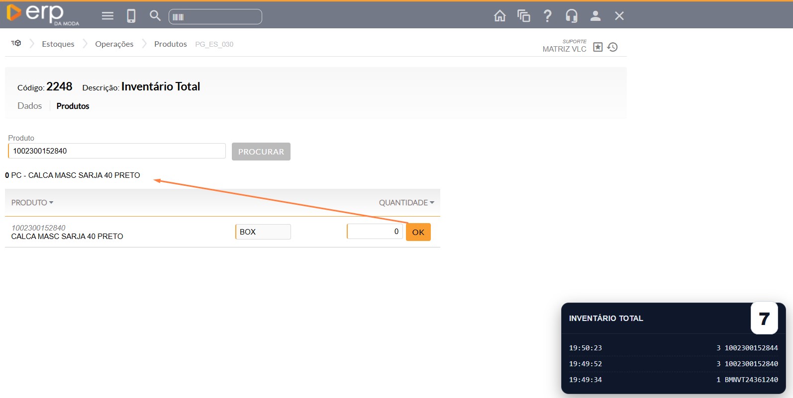 Durante o processo de bipagem no inventário, pode acontecer o registro incorreto de um item — seja por erro de leitura, digitação ou troca de variante. Antes de enviar o inventário para aprovação, é possível corrigir essa contagem diretamente na aba Produtos.